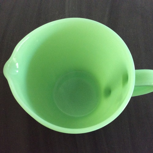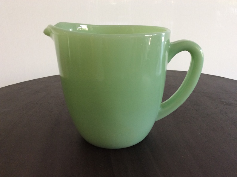 - Jadite Fire-King Milk/Juice Pitcher, 20 Oz. Size is 4 3/8” high x 4 1/4” wide (5 7/8” spout to handle).