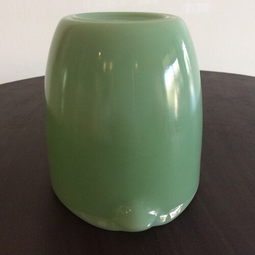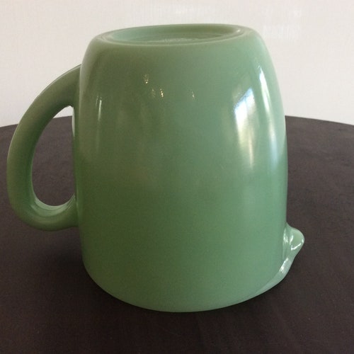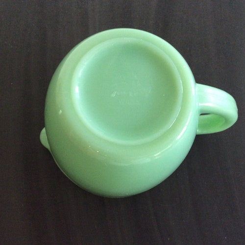 Jadite Fire-King Milk/Juice Pitcher, 20 Oz. Size is 4 3/8” high x 4 1/4” wide (5 7/8” spout shops to handle).