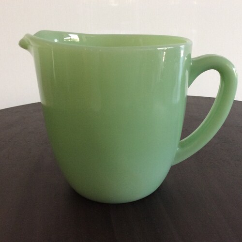 Jadite Fire-King Milk/Juice Pitcher, 20 Oz. Size is 4 3/8” high x 4 1/4” wide (5 7/8” spout shops to handle)., Jadite Fire-King Milk/Juice Pitcher, 20 Oz. Size is 4 3/8” high x 4 1/4” wide (5 7/8” spout to handle). online
