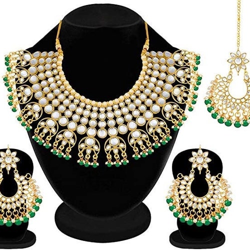 Sabyasachi Inspired Green Bridal Jewellery Set | Indian Bridal Necklace Set shops | Bollywood Heavy Choker Necklace | Jodha Akbar Kundan Necklace, Sabyasachi Inspired Green Bridal Jewellery Set | Indian Bridal Necklace Set | Bollywood Heavy Choker Necklace | Jodha Akbar Kundan Necklace store