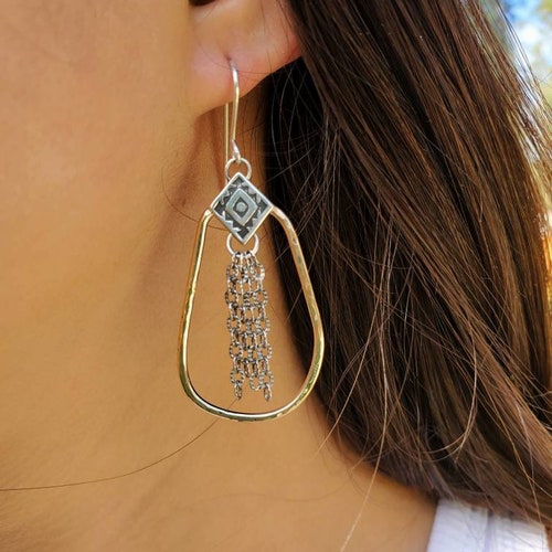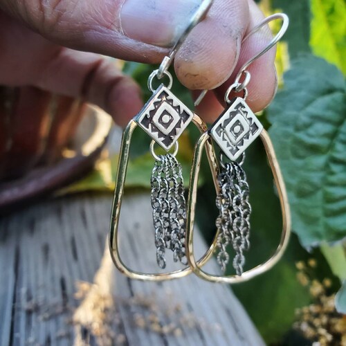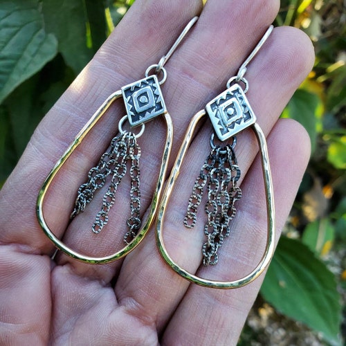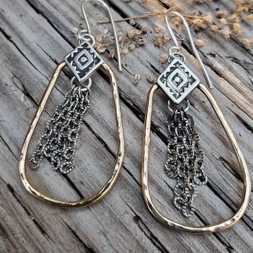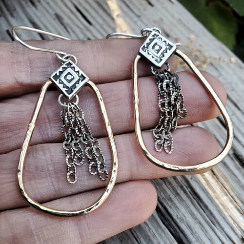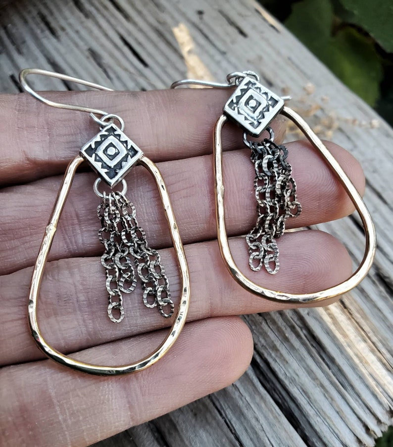 Hammered 14kt gold filled hoops with dark chain fringe, Long Dangles. shops Cowgirl western native American style artisan jewelry