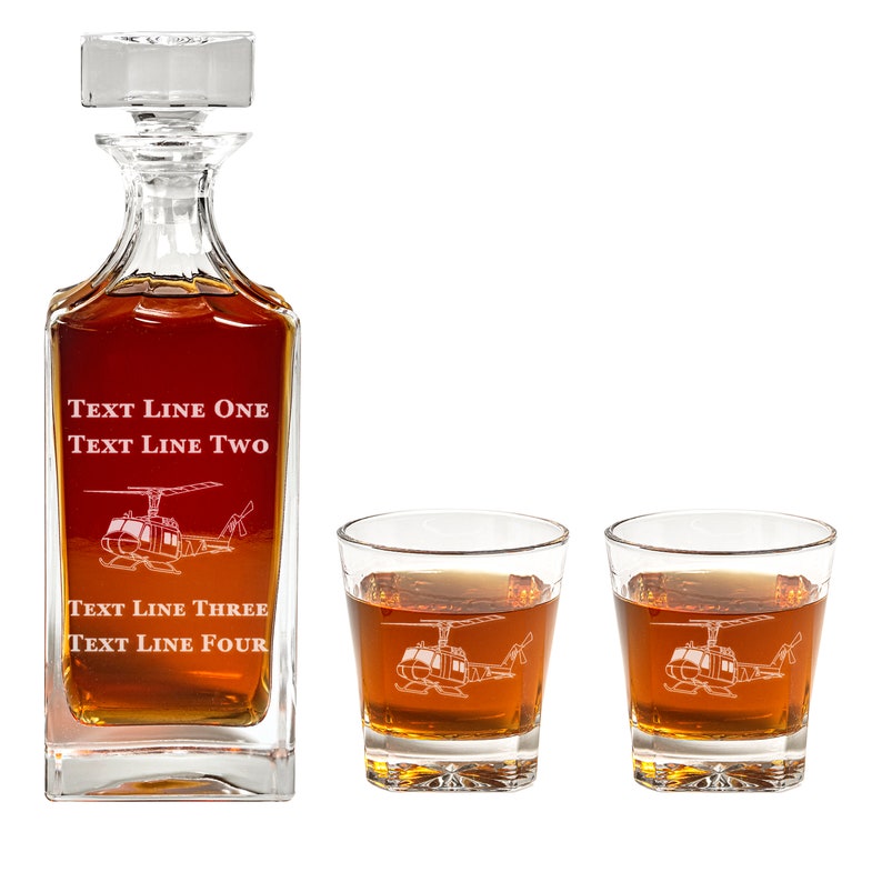 Huey Helicopter Decanter Set - Military Helicopter UH-1 - Unique Gift for Retirement, Promotion, Graduation shops - Present for Heli Pilot "Exceed their expectations by thinking about what's inside their glass. Don't get just any ole decanter, get the someone special in your life a decanter that not only says something about them but stands up to the quality of their expectations. Want to add a beautiful oak box to your order? Follow the link at the bottom of the page.