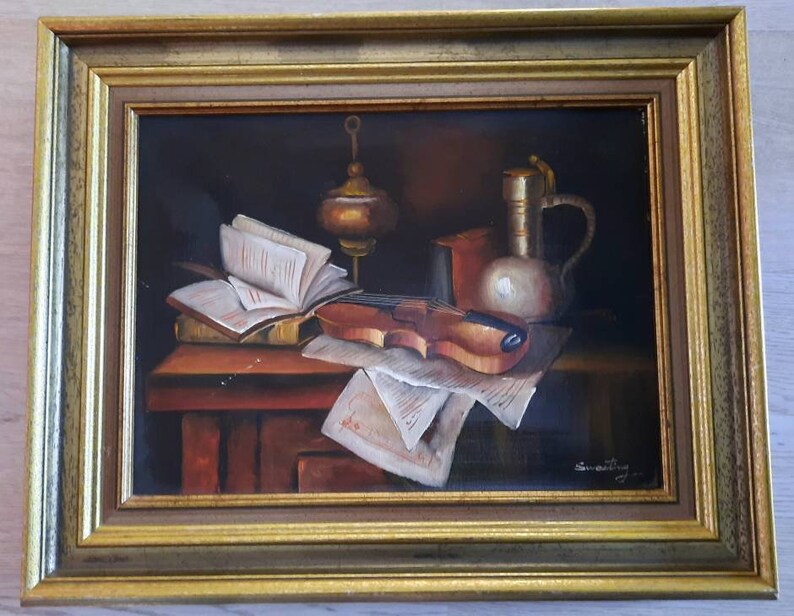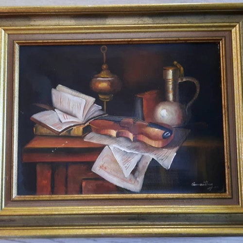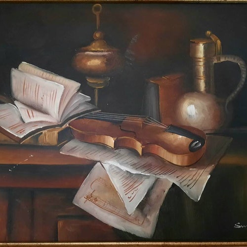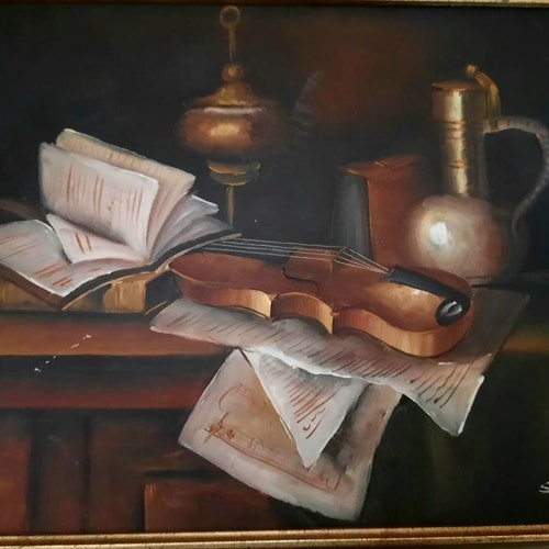 A Charming Middle Size 18th century items Antique Books, Violin Musical Sheets Oil Painting on shops Canvas- Signed, A Charming Middle Size 18th century items Antique Books, Violin Musical Sheets Oil Painting on Canvas- Signed shop