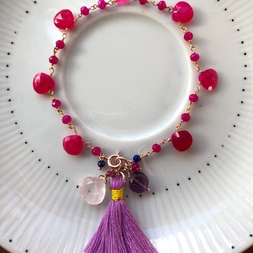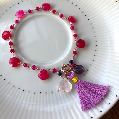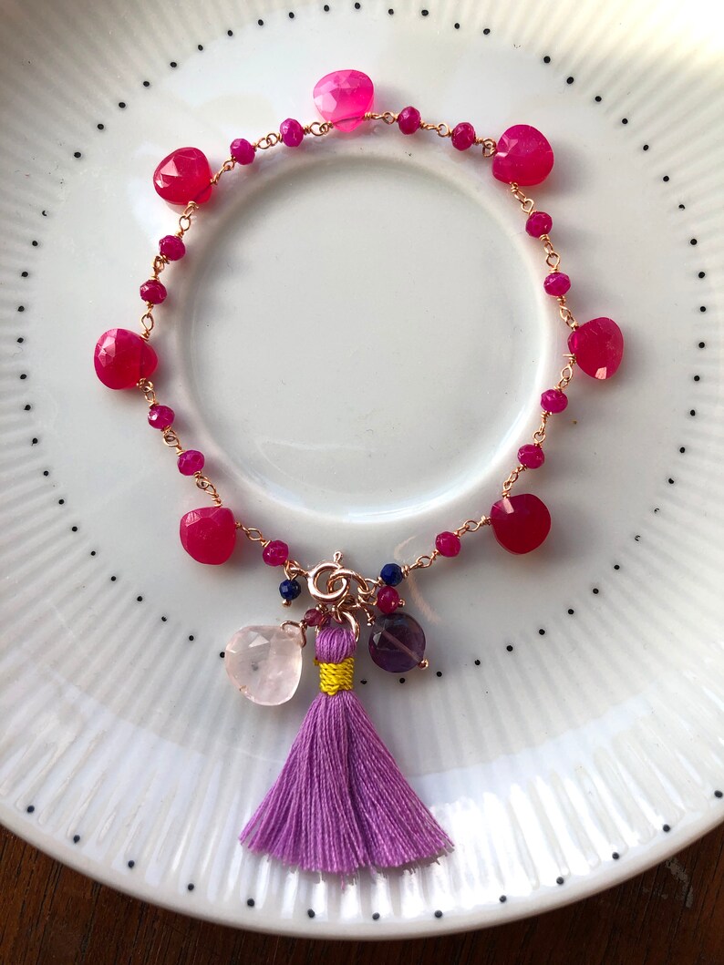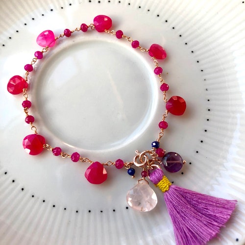 Bright pink chalcedony drops bracelet with shops handcrafted tassle, rose quartz, handmade gemstone bracelet, rose gold plated 925 sterling silver, Bright pink chalcedony drops bracelet with handcrafted tassle, rose quartz, handmade gemstone bracelet, rose gold plated 925 sterling silver order