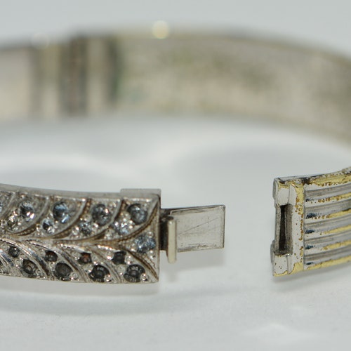 Vintage Art Deco ALLCO Blue Rhinestones Rhodium Plated Bangle BRACELET 1920s Hinged, shops Gifts for Women, Gifts for Her.
