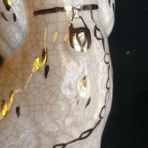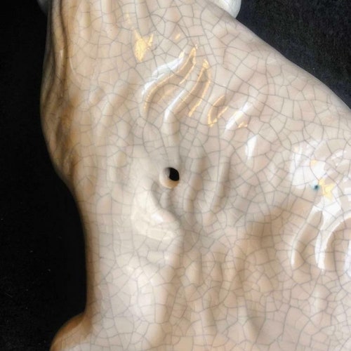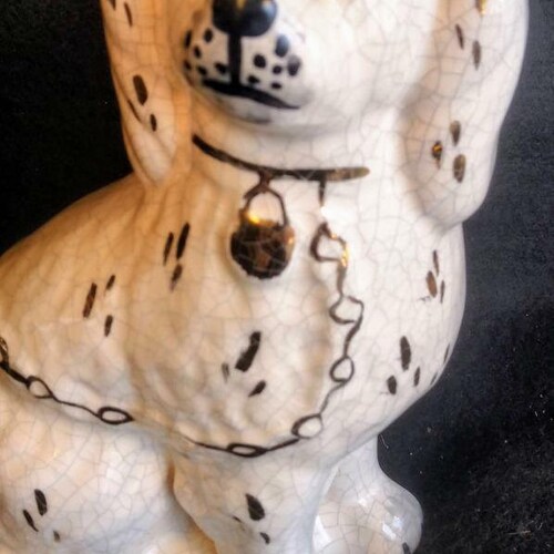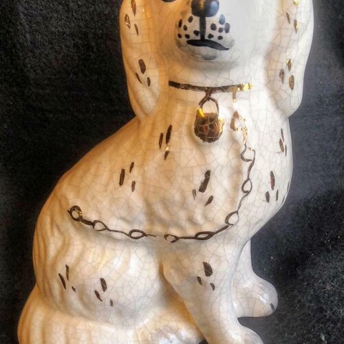Vintage shops Staffordshire Art Pottery Dog Ceramic Statue England English Spaniel This is a nice vintage dog statue (see photos). The item looks to be made of ceramic or pottery (see photos). The item looks to be an English Staffordshire Dog statue (see photos). The item is not marked by a maker, but it does have a date scratched into the underside of the base (see photos). This looks to be a vintage reproduction Staffordshire dog ad not an antique one to me (see photos). The item not marked by a maker so I do not know the maker or the origin, but I would guess that it is English in origin (see photos and decide the age, the origin and the maker). The statue in total measures about 8.5 inches high, it is about 4.5 inches from the front edge to the back side and it is about 6.25 inches wide. The item has some obvious probably intentional crazing and some wear (see photos and / or written description for the condition of this item). This is a nice dog statue to add to your collection.