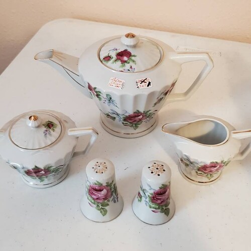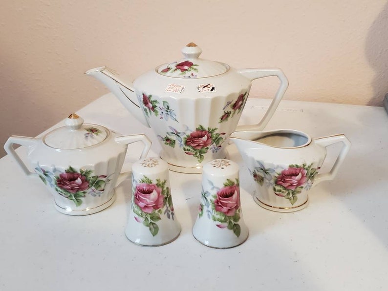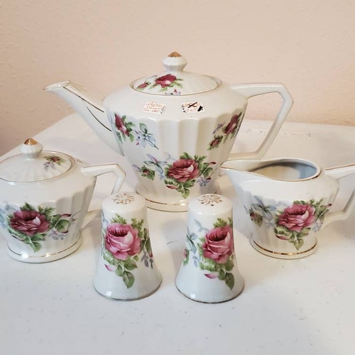 Lefton Cina shops Tea Pot Set Creamer Sugar Salt Pepper Shakers, Lefton Cina Tea Pot Set Creamer Sugar Salt Pepper Shakers authentic