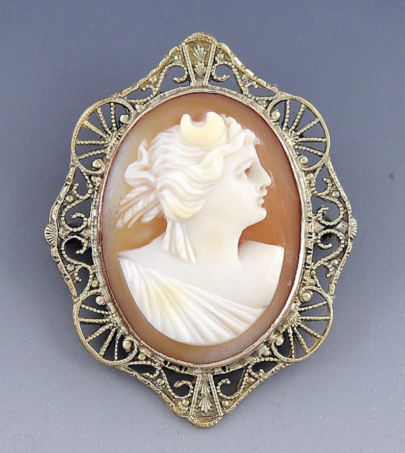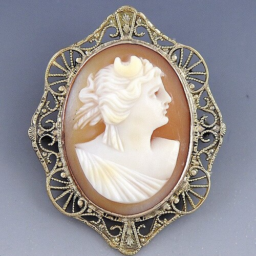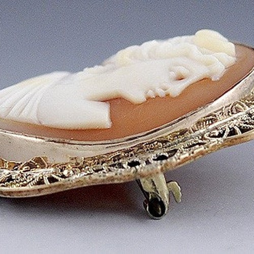 - Pretty Victorian Gold Filled Filigree Hand Carved Shell Cameo Pin Brooch
