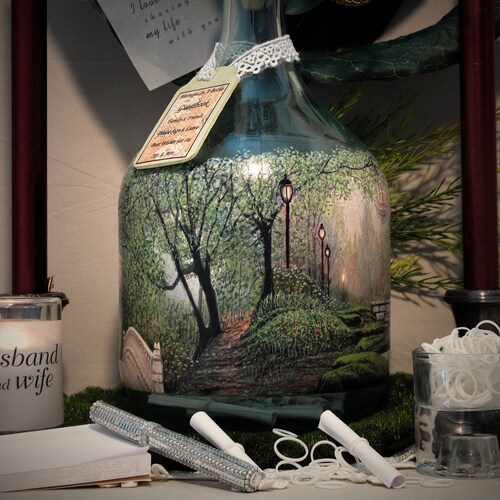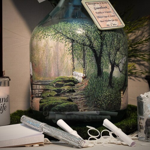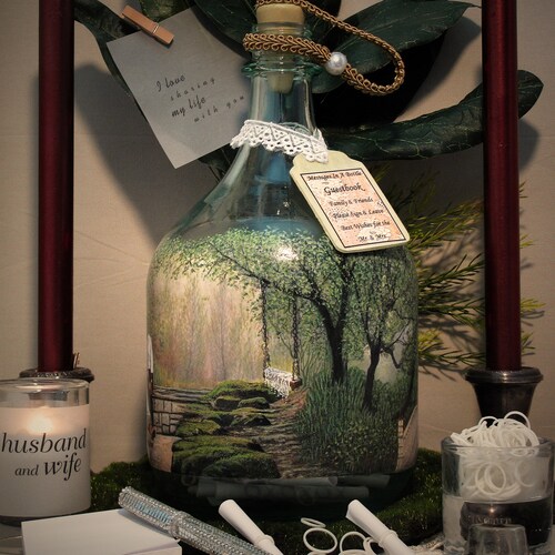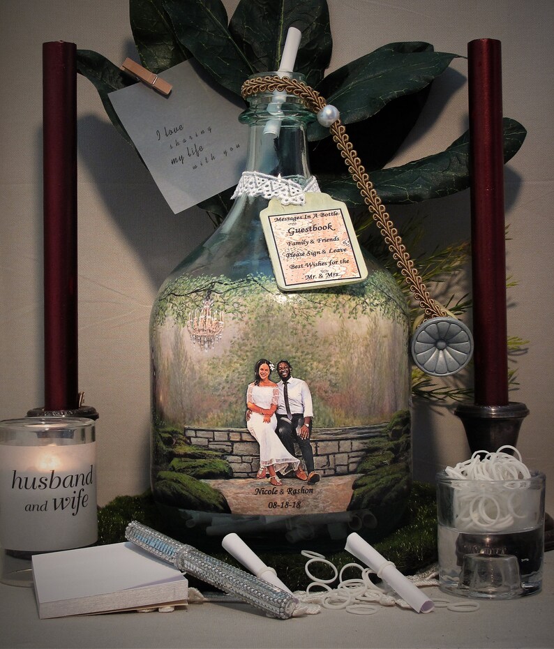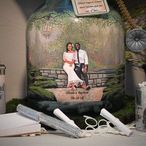 Personalized Guest Book Alternative, Messages In A Bottle Guestbook With Your Photo and Hand Painted Embellishments, Vintage Theme Decor shops Thank you for visiting YTB Creations! This item is an EXAMPLE of what I can create with your digital photos. These unique “Message In A Bottle” guestbooks or “First Anniversary Well Wishes” bottles are created with the client's digital photo and my hand painted artwork. If you are interested in a custom order with your photo, please contact shop owner first regarding your specific scheduling needs and I will provide a completion date. Please read through detailed steps of the ordering process below. I DO NOT REQUIRE PAYMENT UNTIL YOUR ORDER IS COMPLETE and images of your order are uploaded into your "Reserved" Etsy Listing. Included accessories are listed below (other items depicted in the photos are display ideas). Lastly, feel free to browse my shop home page to view many examples of my creations and other styles offered.