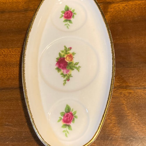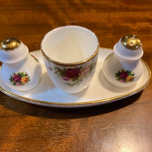 ROYAL ALBERT, 1962, Old Country Rose, Porcelain Breakfast/Brunch, Salt/Pepper And Egg Cup Serving shops Set With Oval Under Dish-Made In England, ROYAL ALBERT, 1962, Old Country Rose, Porcelain Breakfast/Brunch, Salt/Pepper And Egg Cup Serving Set With Oval Under Dish-Made In England fashion