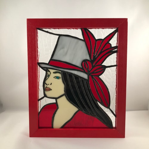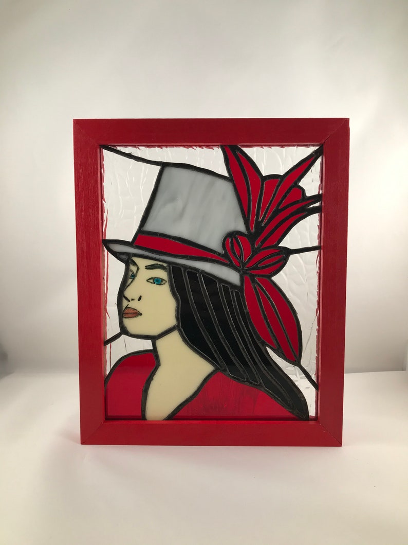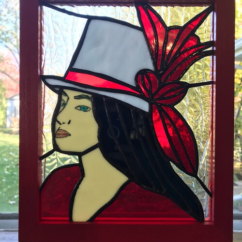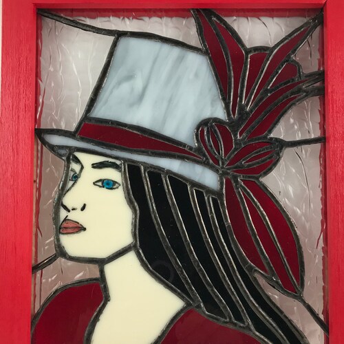- Victorian era/steampunk stained glass woman's profile portrait gray hat-red feathers. Handmade-Glass Art.
