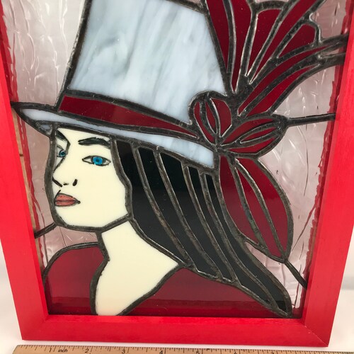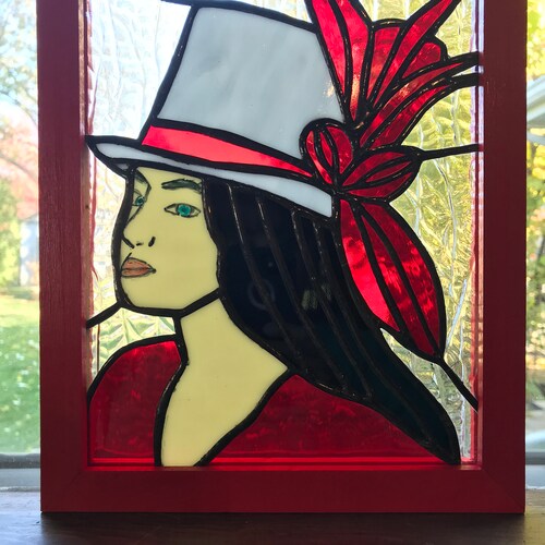 Victorian era/steampunk stained glass woman's profile shops portrait gray hat-red feathers. Handmade-Glass Art., Victorian era/steampunk stained glass woman's profile portrait gray hat-red feathers. Handmade-Glass Art. store