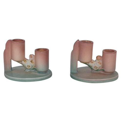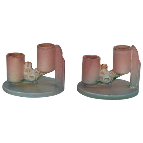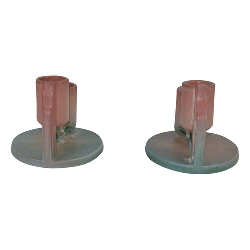 - Roseville Pottery Ixia Pink Candle Holders 1127