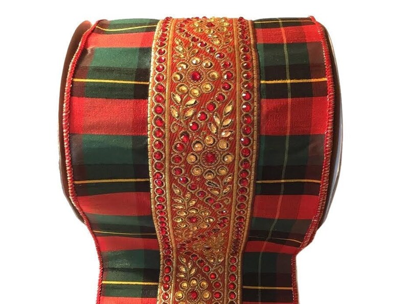 LUXE Designer Ribbon: 6" X 10yds Dupioni, Embroidered Red & Gold Crystal Gem Floral And Vine Center Trim Design On Red/Green/Gold shops Plaid, LUXE Designer Ribbon: 6" X 10yds Dupioni, Embroidered Red & Gold Crystal Gem Floral And Vine Center Trim Design On Red/Green/Gold Plaid collection