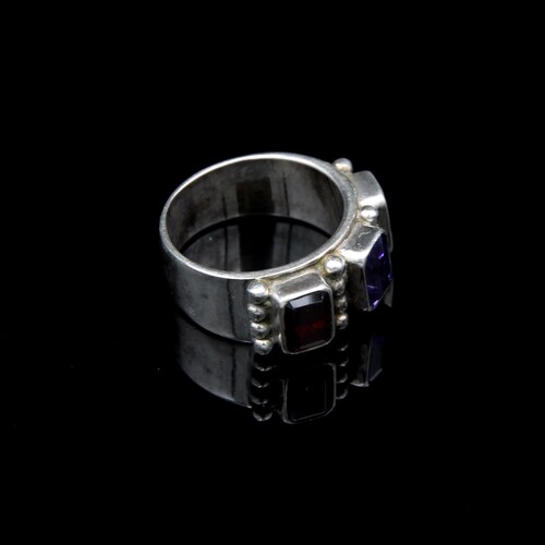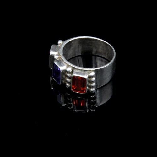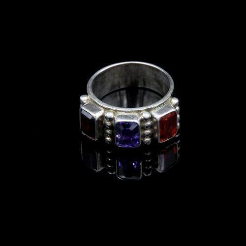 - Signed KumKum Sweden 925 Sterling Silver Three Stone Multi Colored cz Band Ring