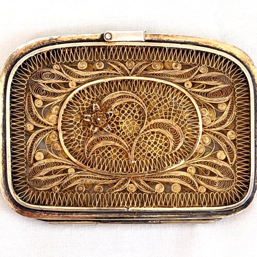 - Gilt silver filigree calling card case; 3 x 2 1/8 x 1/8 inches, 26.6 grams
