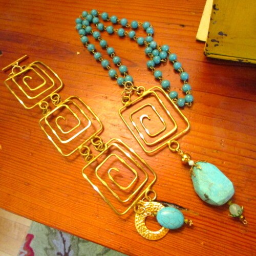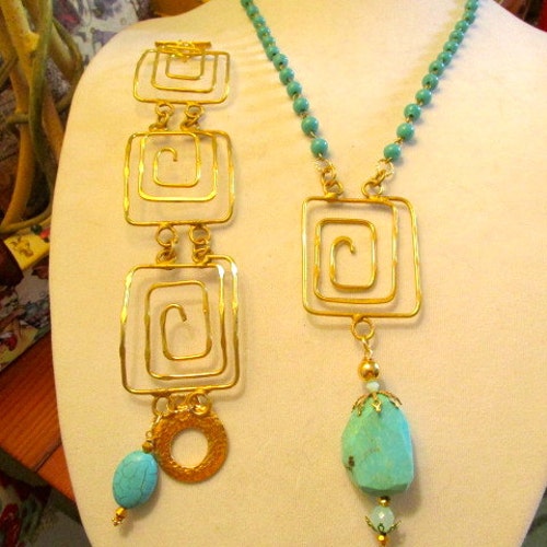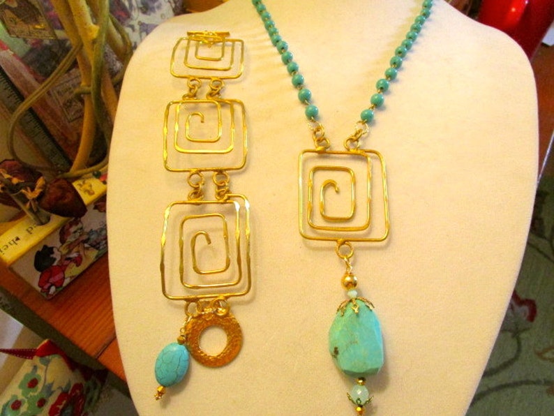 Amazing GENUINE Vintage TURQUOISE Rosary Chain shops w/Rare Greek Deco Spiral Solid Brass & Huge Raw TURQUOISE and Gold Pendants/Matching Bracelet