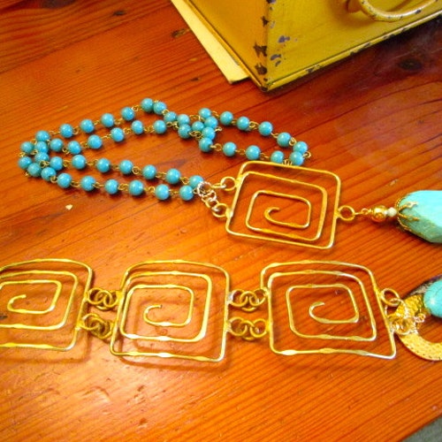 Amazing GENUINE Vintage TURQUOISE Rosary Chain shops w/Rare Greek Deco Spiral Solid Brass & Huge Raw TURQUOISE and Gold Pendants/Matching Bracelet Almost too much to bear!