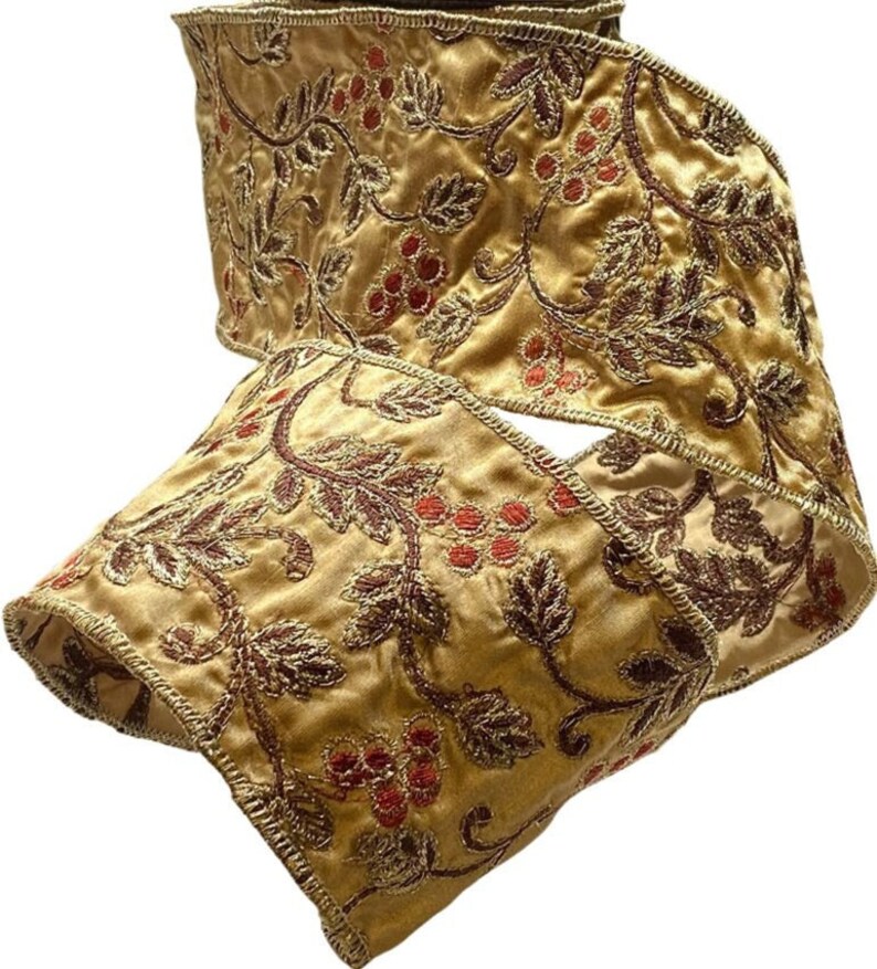 - LUXE Designer Ribbon: 4" X 5yds, Embroidered Gold & Brown Thread Floral Leaf Design w/Red Berries On Gold Dupioni Ribbon, Gold Wire Edge
