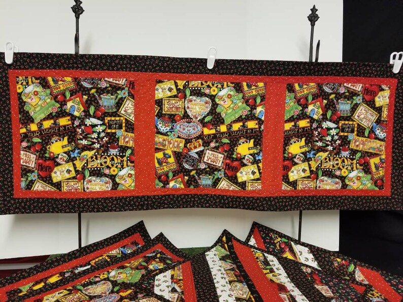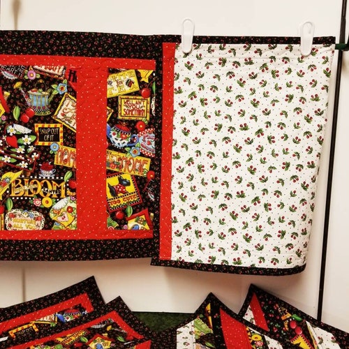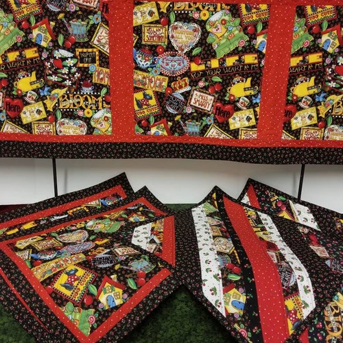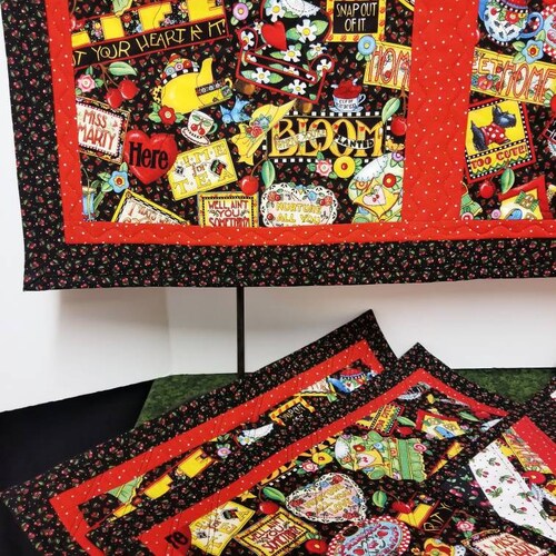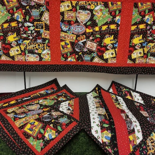 Mary Engelbreit placemats and runner in a larger size. Each mat is 18 x 16 inches. Runner is 45 x 16.5 inches. Both are two shops sided. Customize