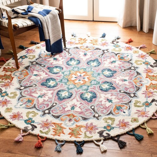 Novelty Colorful Floral Wool Area Rug, Pink/Blue, 5' x 5' Round, shops 100% Wool, Pile Height: 0.5 in. shops Novelty Rug Collection. Creatively Designed Floor Coverings. The Collection of creatively designed floor coverings features uniquely styled carpets with striking motifs, bold, vibrant colors and a deep, soft wool pile. Available in an assortment of sizes and designs that are ideally suited as decorative floor coverings for the kitchenette and hallways or child's playroom. Elegantly designed, each rug provides comfort and luxury to complement your style. Durably construction, these Novelty rugs are the perfect addition in your home for a chic upgrade.