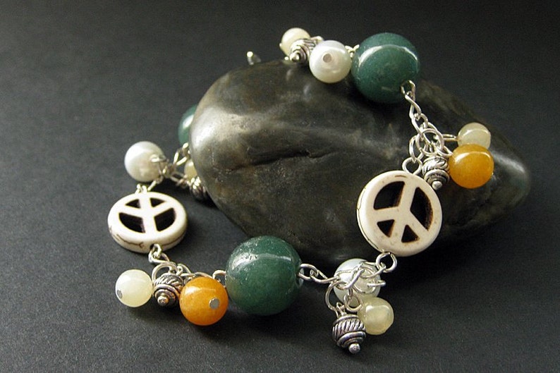 Hippie Bracelet. Peace Bracelet. Peace Sign Charm shops Bracelet. Gemstone Bracelet with Howlite, Orange Jade, and Aragonite. Handmade Jewelry., Hippie Bracelet. Peace Bracelet. Peace Sign Charm Bracelet. Gemstone Bracelet with Howlite, Orange Jade, and Aragonite. Handmade Jewelry. sell