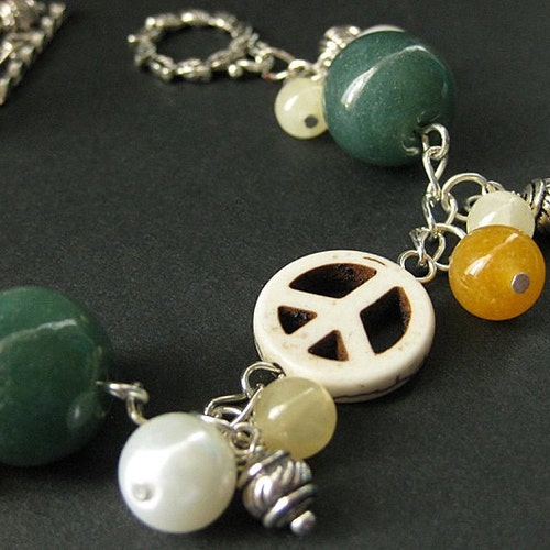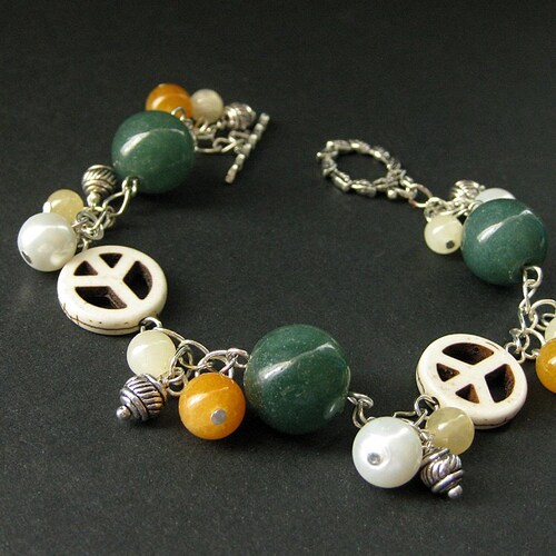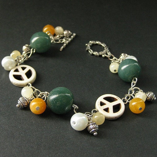 - Hippie Bracelet. Peace Bracelet. Peace Sign Charm Bracelet. Gemstone Bracelet with Howlite, Orange Jade, and Aragonite. Handmade Jewelry.
