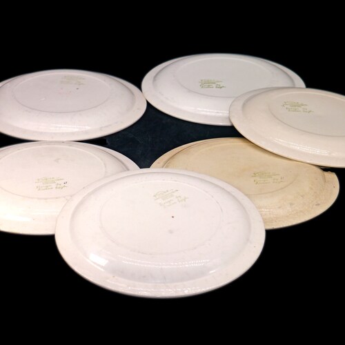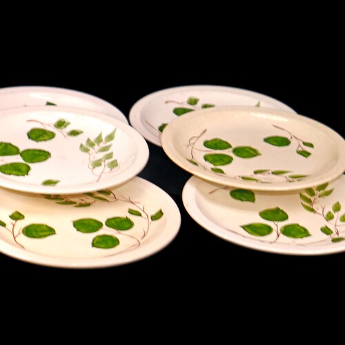 In GOOD! vintage condition with NO! chips, nicks, cracks, or fleabites. Three of the six plates show significant yellowing to the front. All plates show age-appropriate crazing, wear and yellowing to the REVERSE!, noticeable when they are over-turned and some utensil marks and smudges to the front. The leaf and branch pattern is bright and vivid with NO! fading apparent. PLEASE REVIEW EACH OF THE POSTED PHOTOS FOR A COMPLETE VISUAL OF THE ITEMS.