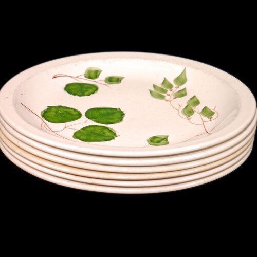 Six Simpsons Potters Vogue salad plates. Diana Legh design made in shops England. Flaws (see below). SET OF SIX (6) early mid-century (1942) and hard to find Simpsons Potters Vogue salad or side plates. Hand-painted ivy and brown branches designed by Diana Legh made in England.