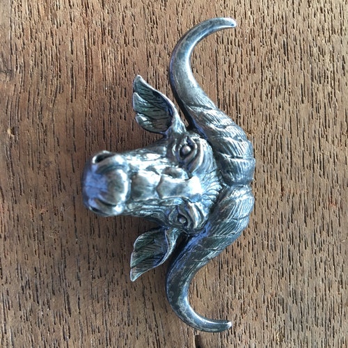 Buffalo brooch sliver shops or gold with ruby , enameled black