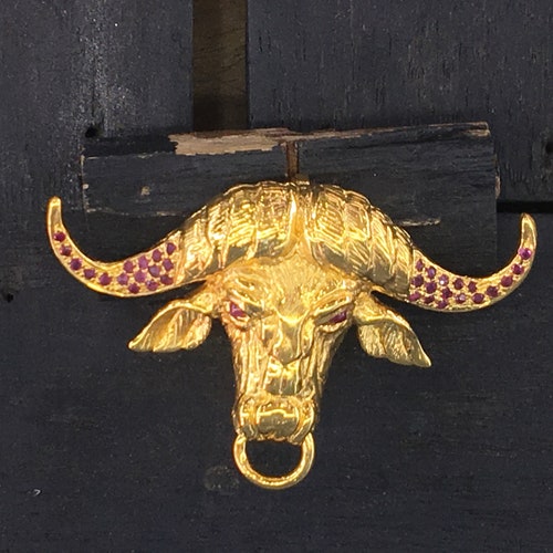 - Buffalo brooch sliver or gold with ruby , enameled black