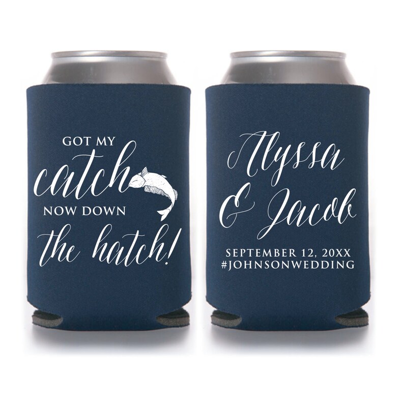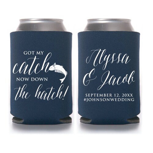 Fishing Wedding Can Coolers, Wedding Favors, Wedding Drinkware, Got My Catch, Beer Can Coolers, Beer Sleeves, Navy, shops Fish - T356 -----------TURNAROUND TIMES SUMMARY----------