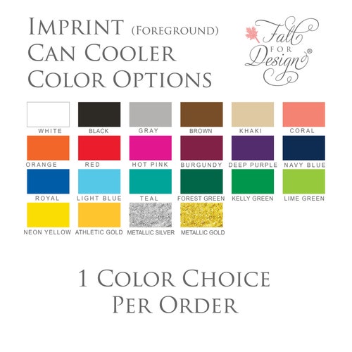 Due to the nature of how each screen monitor displays different lights and colors, there may be a slight variation in color tone from what you see on your screen from the actual can cooler that arrives at your door. Fall For shops Design LLC is not held responsible for the clients computers displaying varying color tones. Color samples are a close match.