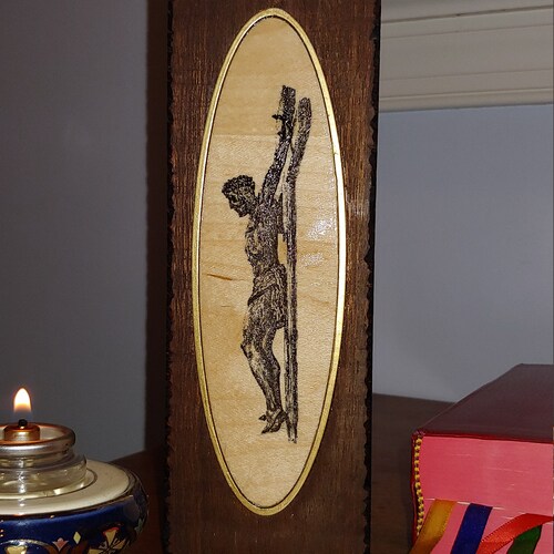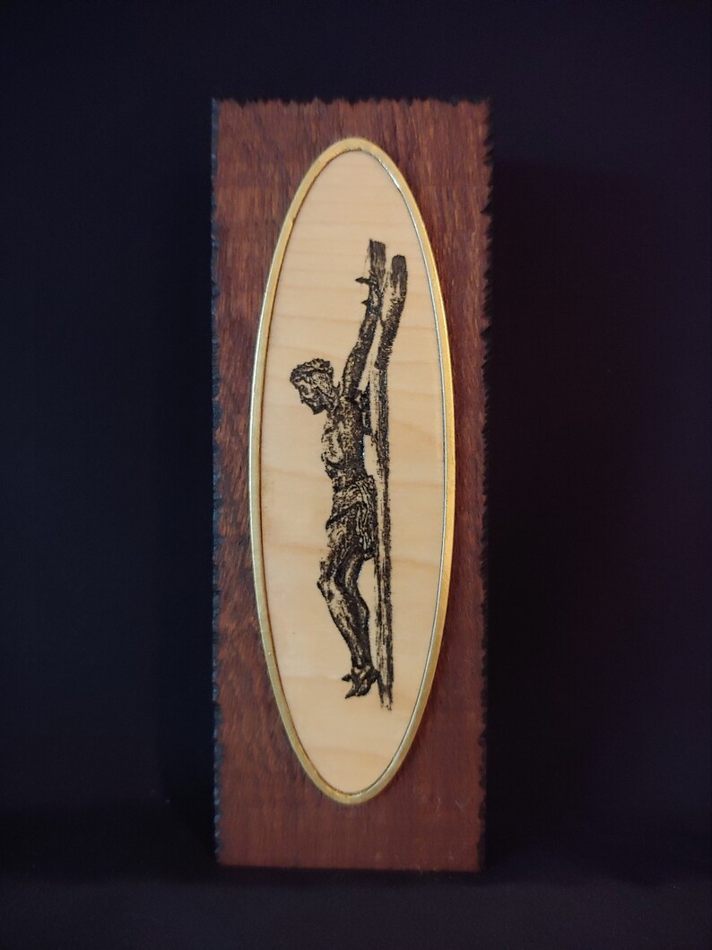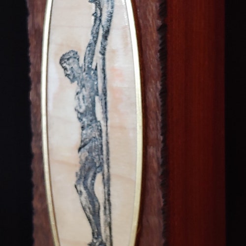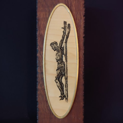 Keeley Cross - Wood Inlay Block shops (7"H x 3"W x 2"D) THIS ETCHING: "Keeley Cross" inlay wood block - created in dedication to a humble church artist Walter Paul Keeley. Original illustration circa 1956 and the engraving was shops specially designed and crafted for the Keeley family. It is offered with their generous permission in keeping with Walt's desire to foster faith and devotion to Jesus through art.