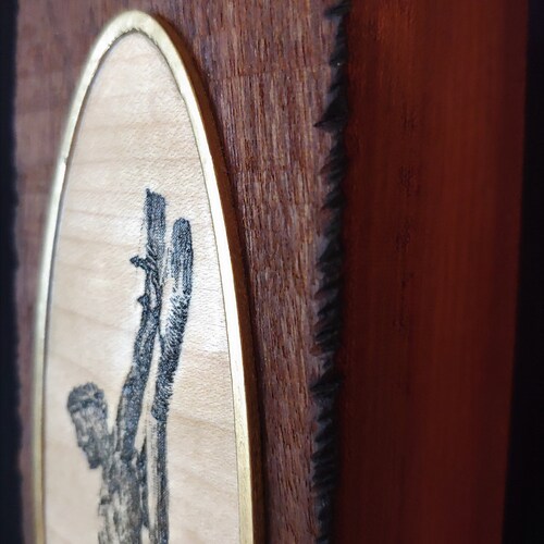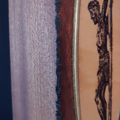 Perspective: Crucifixion view of the thief. Rough Block Face: The physical harshness of the cross. Distressed Edge: The passion of Christ. Burnt Edge: The offered sacrifice of Christ for our sins. Golden Mandorla: Radiant light of Christ's divine grace. Finished Wood: The beauty and depth of Christ's love for us. Bee's Wax Finish: The purity of Christ. Sapele Mahogany: Spiritual healing and spiritual growth.