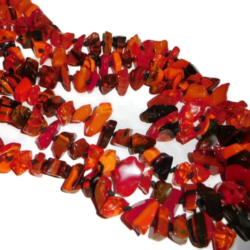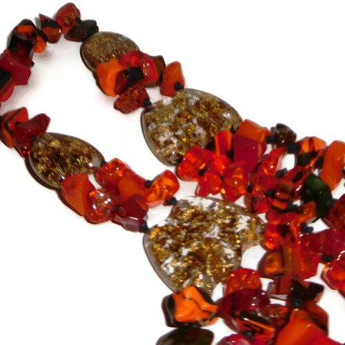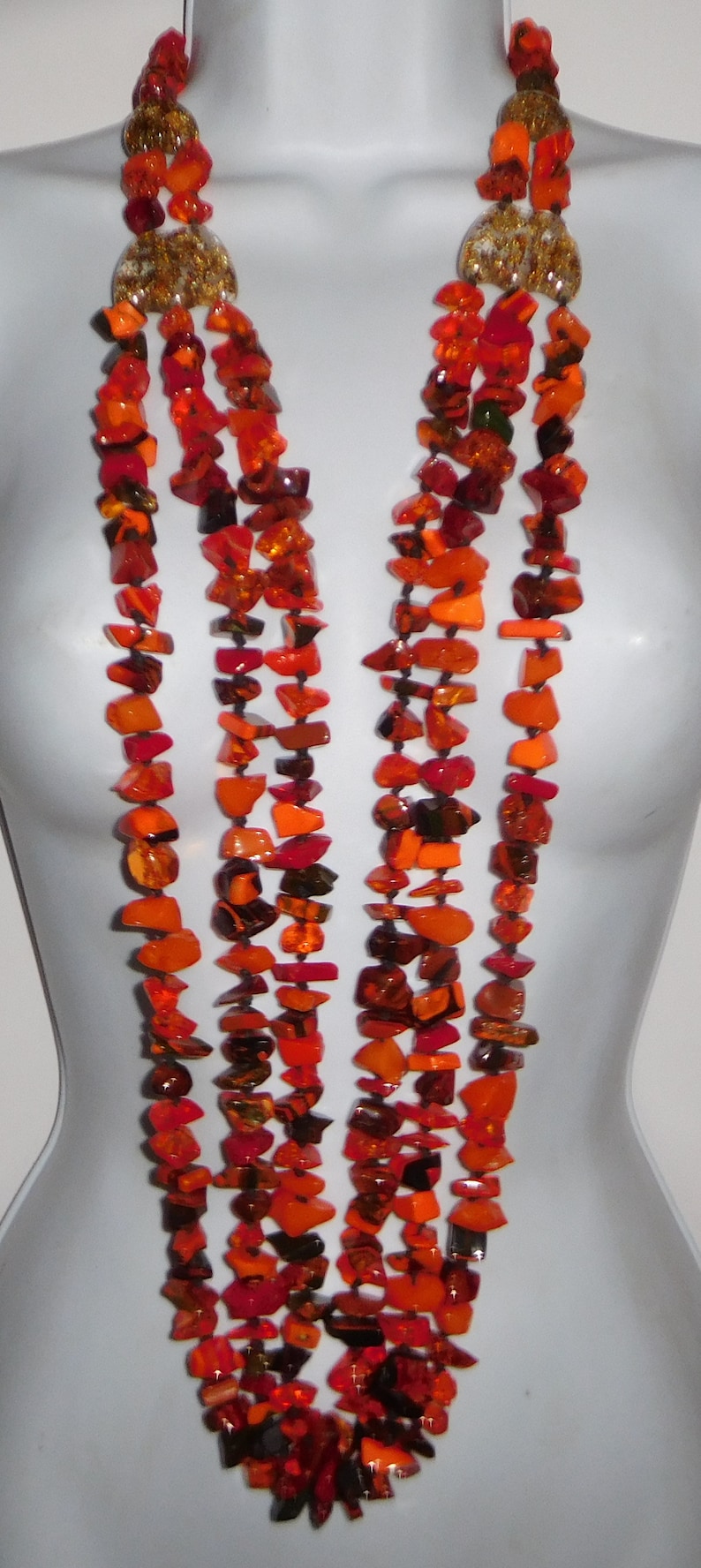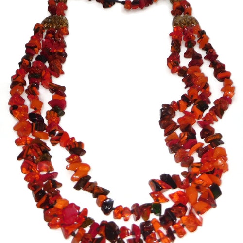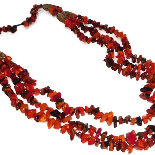 In my special shops order I had the necklaces and bracelets done in 13 different color patterns. This necklace is called Poti and it is the Orange version. It is a mix of orange beads with several red, black and brown accents. This necklace is exceptional and wow! What a statement! There are 4 gold metalique inclusion accents with the strands graduating from three in the middle down to one at the closure. You can't help but feel regal when you it put on. What a rare beauty! The total length of the longest strand is 51“ and the shortest is 47“. I also have the matching bracelet available. Just as a note, this is the last Orange mix Poti necklaces.