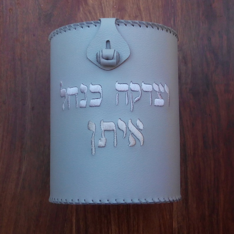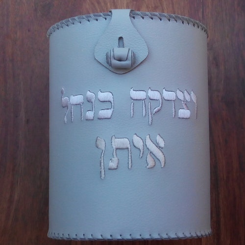 - Abig tzedakah box, leather art,judaica in handmade, jewish tzedaka box