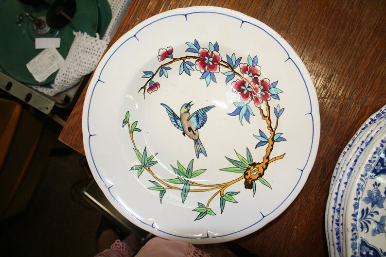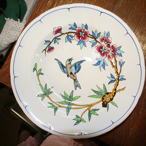 Set of 6 hollow plates decoration birds and insects shops longwy XIXeme, Set of 6 hollow plates decoration birds and insects longwy XIXeme retail