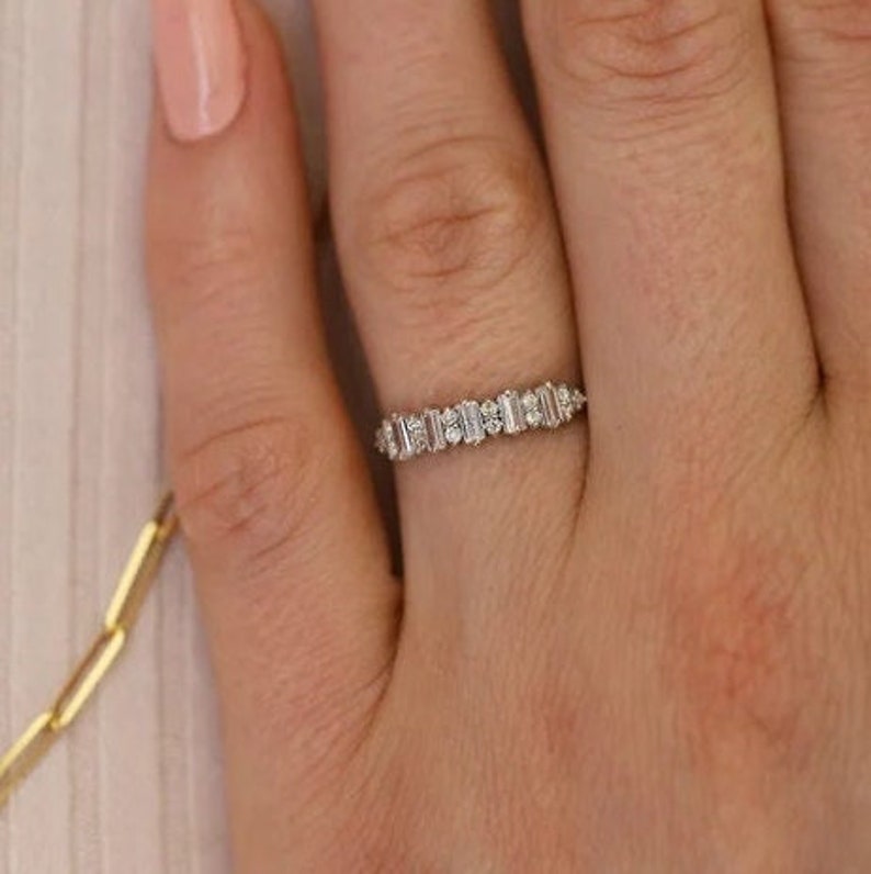 - Round & Baguette Cut Moissanite Band, Half Eternity Wedding Band, 14K White Gold Band, Vintage Stackable Band, Bridesmaid Gifts